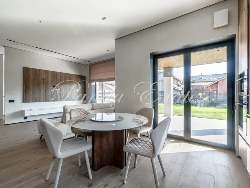 ID 9526 Стильный новый дом 210 кв м в охраняемом коттеджном посёлке Аносино на Новорижском шоссе. Дом построен по индивидуальному проекту в современном стиле с панорамным остеклением. Коттеджный посёлок Аносино парк удачно расположен на Новорижском шоссе в престижном районе с благополучной экологией и развитой современной инфраструктурой. Участок выровнен, сделан дренаж, газон. На участке есть хозяйственное помешение для хранения садового инвентаря. Брусчаткой выложена въездная группа, навес на два машиноместа.. Современные технологии освещения пространства дома и участка, по периметру выведены камеры наружного наблюдения. Дом полностью укомплектован встроенной мебелью спроектированной именно для этого объекта. Первый этаж: Просторная и светлая гостиная с панорамными окнами имеет выход на уютную террасу, где можно проводить время, наслаждаясь природой. Кухня с встроенной техникой и современным освещением. Для комфорта предусмотрена спальня, большой с/у.,...